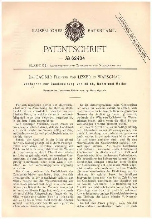 Original Patentschrift - Dr. C. Freiherr von Lesser in Warschau , 1891 , Condensierung von Milch , Molke und Rahm !!!