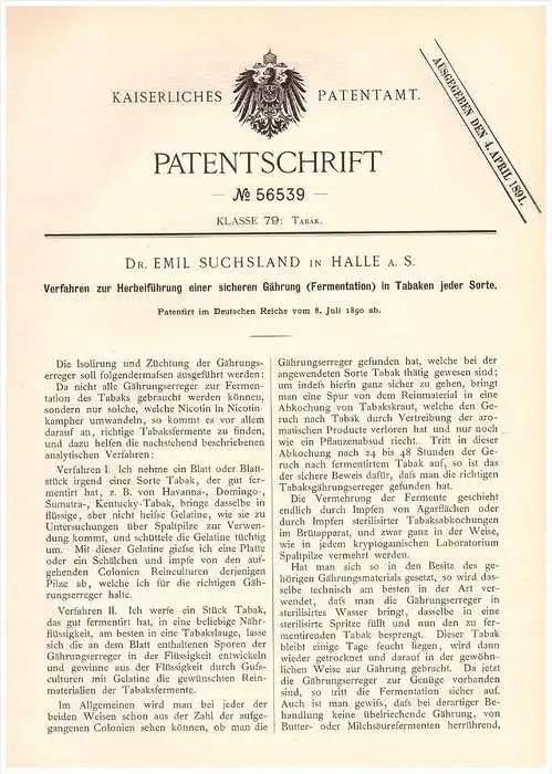 Original Patentschrift - Dr. Emil Suchsland in Halle a.S., 1890 , Tabak - Gährung , Cigarette , Cigarren , Nikotin !!!
