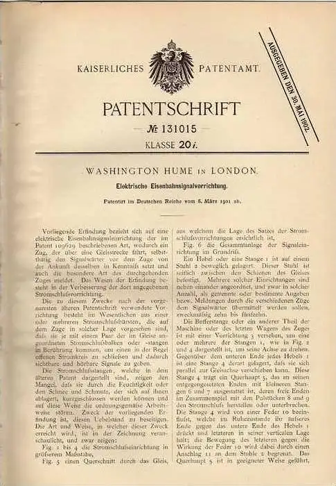 Original Patentschrift - Eisenbahn Signalvorrichtung , 1901 , Washington Hume in London !!!