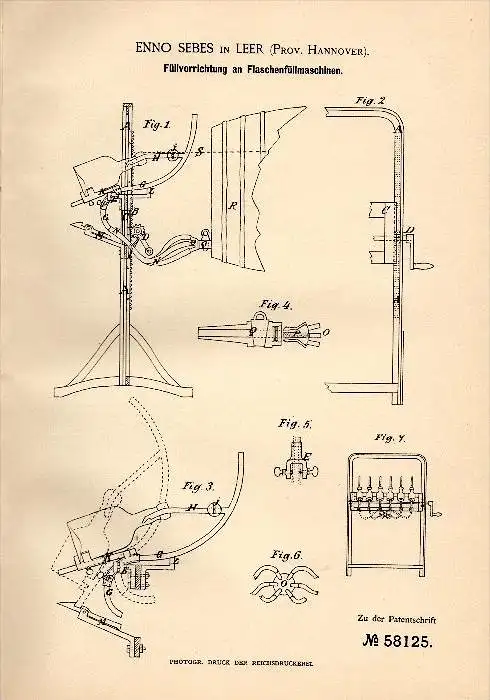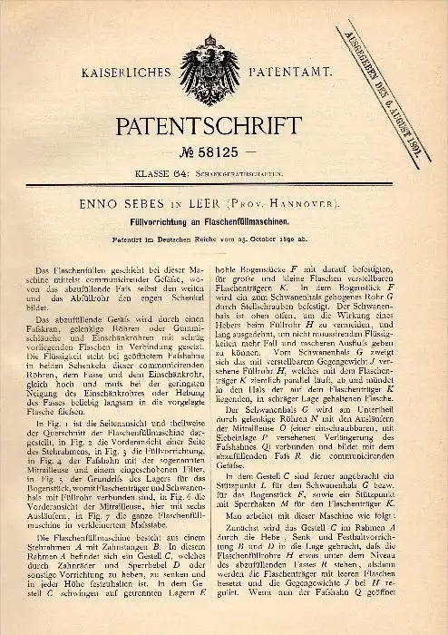 Original Patentschrift - Enno Sebes in Leer , Prov. Hannover , 1890 , Flaschenfüllmaschine , Flaschen !!!