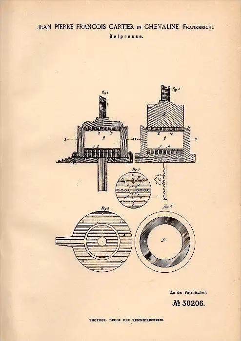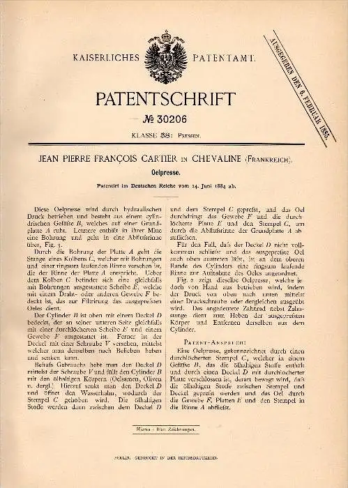 Original Patentschrift -J. P. Francois Cartier dans Chevaline , 1884 , presse à huile , Faverges !!!