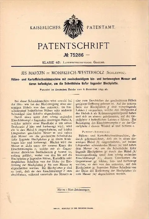 Original Patentschrift - Jes Marxen in Mohrkirch - Westerholz , 1893 , Rüben- Kartoffelschneidemaschine , Landwirtschaft