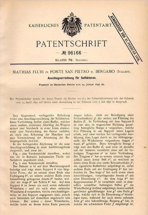 Original Patentschrift - M. Fluri in Ponte Pietro , 1897 , Apparecchi per la filatura macchina, la filatura , Bergamo !!