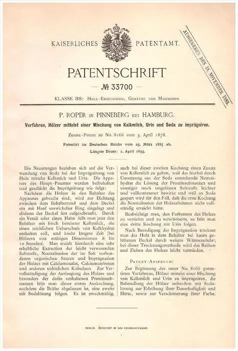 Original Patentschrift - P. Roper in Pinneberg , 1885 , Holz - Imprägnierung mit Urin und Soda , Forst , Tischlerei !!!