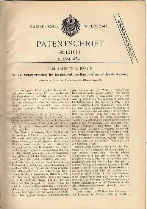 Original Patentschrift - Registrierkasse , Kasse , 1900, C. Laurick in Berlin !!!