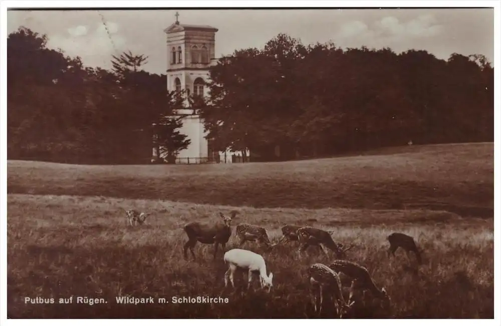 alte AK , Putbus auf Rügen 1927 , Wildpark mit Kirche , Mecklenburg !!!