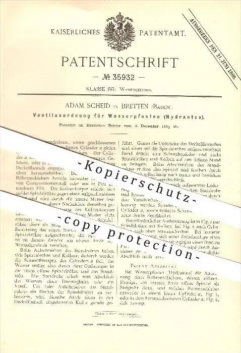 original Patent - Adam Scheid in Bretten , 1885 , Ventile für Wasserpfosten , Hydrant , Wasserleitung !!!