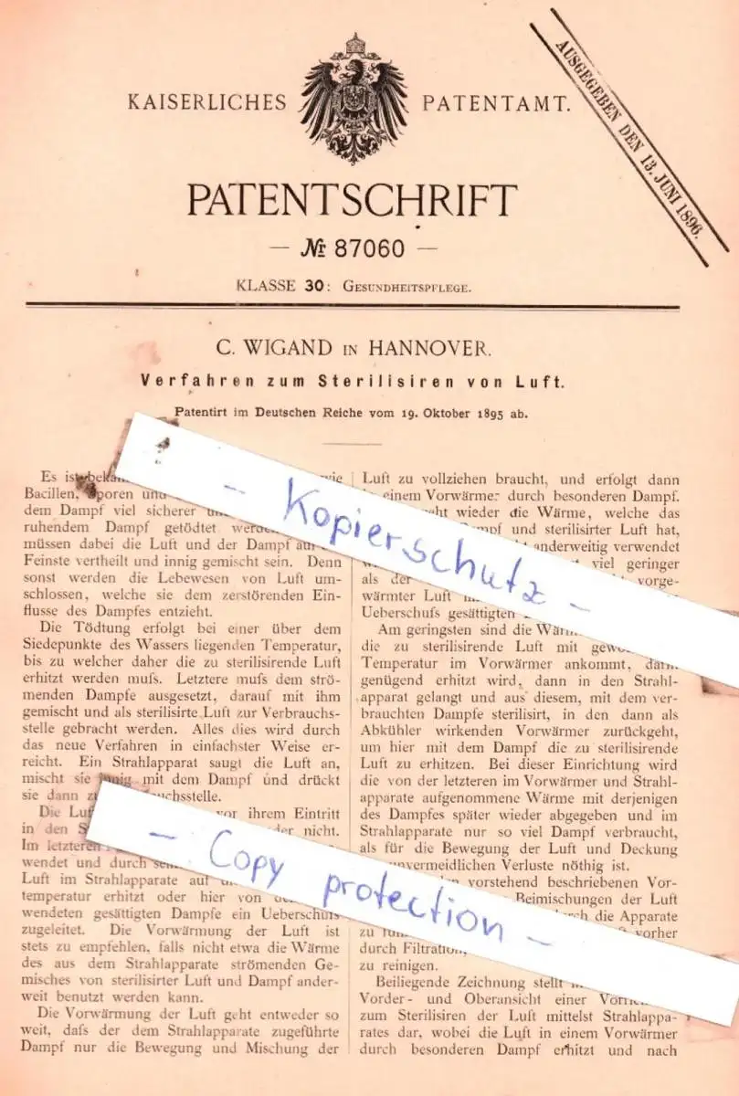 original Patent - C. Wigand in Hannover , 1895 , Verfahren zum Sterilisiren von Luft !!!