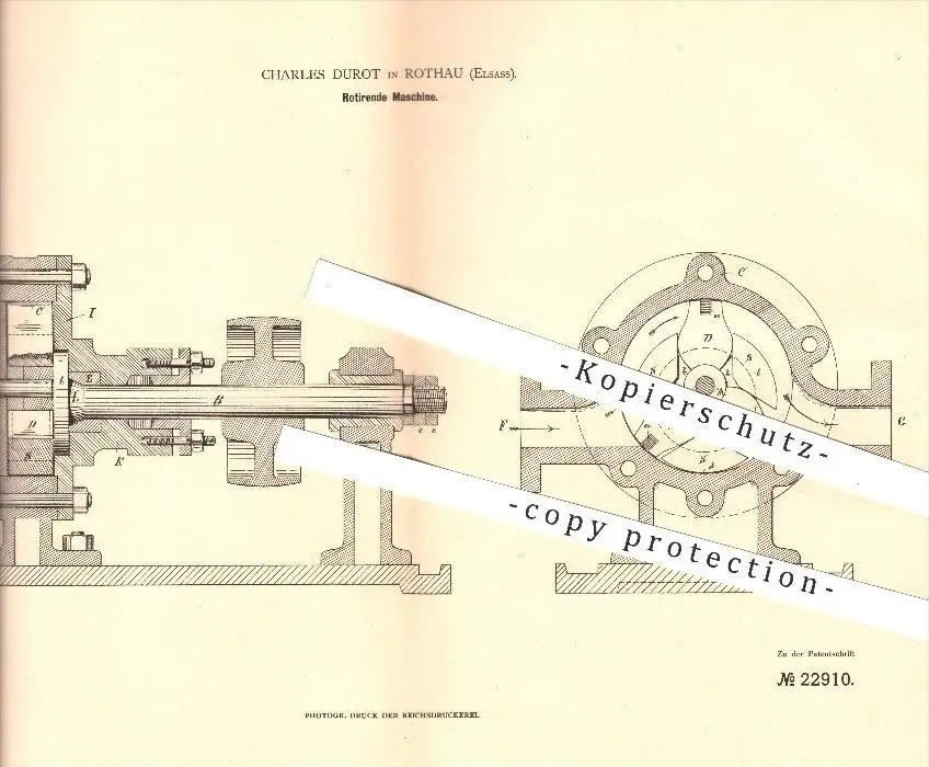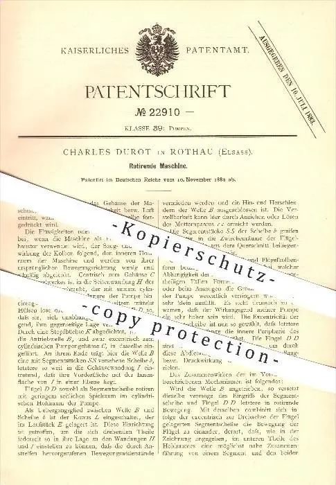 original Patent - Charles Durot à Rothau , 1882 , machine tournante , pompe !!!