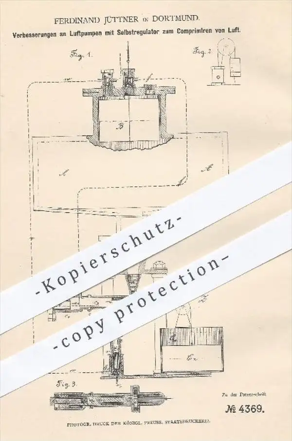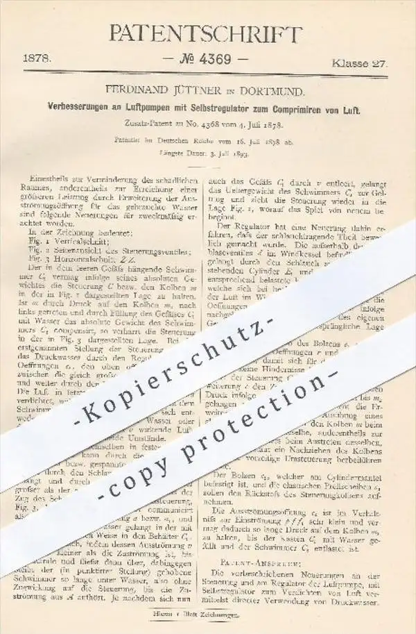 original Patent - F. Jüttner , Dortmund , 1878 , Luftpumpen mit Selbstregulator zur Luft - Kompression | Regulator !!