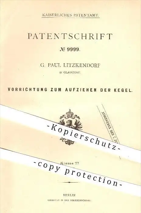 original Patent - G. Paul Litzkendorf in Glauchau , 1880 , Aufziehen der Kegel , Kegeln , Kegelbahn , Bowling , Sport !!