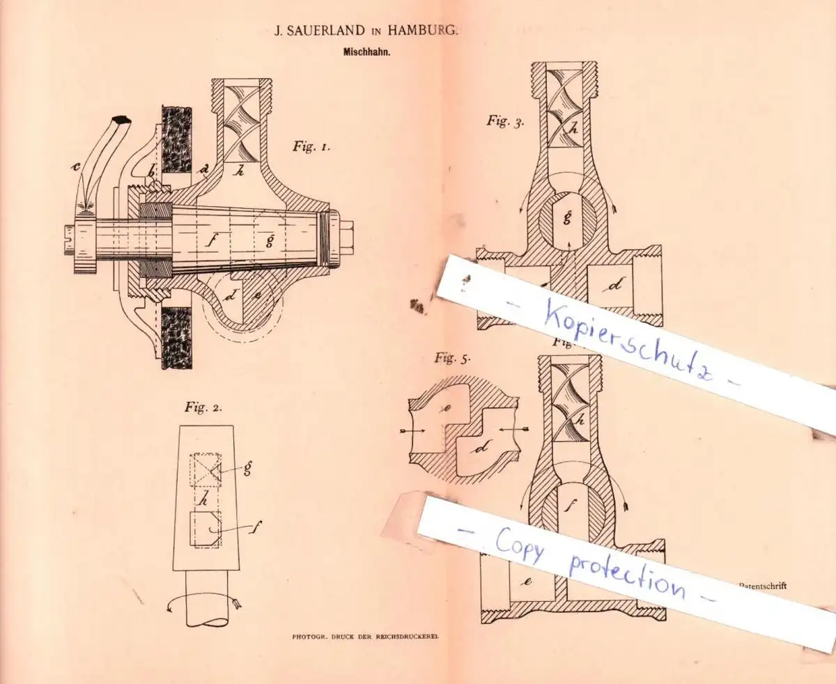 original Patent - J. Sauerland in Hamburg , 1895 , Mischhahn !!!