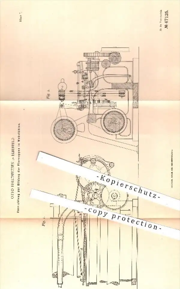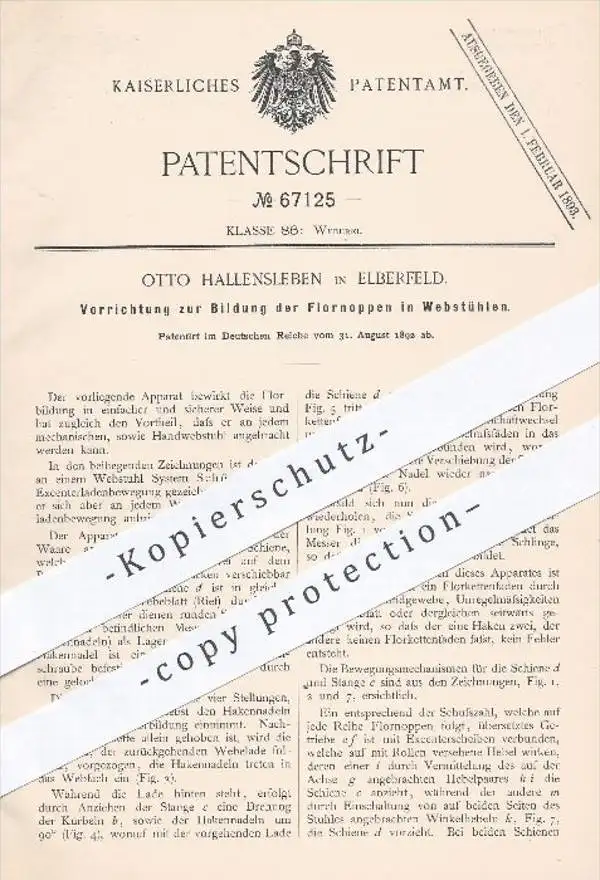 original Patent - Otto Hallensleben in Eberfeld , 1892 , Bildung der Flornoppen im Webstuhl | Webstühle , Weben , Weber