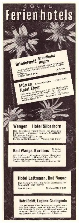 original Werbung / Reklame - 1959 - Ferienhotels Bad Wangs , Ragaz , Wengen , Mürren , Grindelwald , Lugano , Hotel !!!