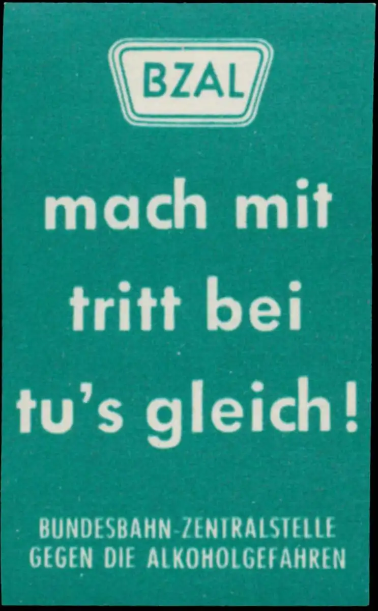 Bundesbahn, Eisenbahn, Bundesbahn-Zentralstelle gegen die Alkoholgefahren, Größe/Zustand: 5x3 , guter Zustand, Original alte Reklamemarke die seinerzeit für die Werbung benutzt wurde