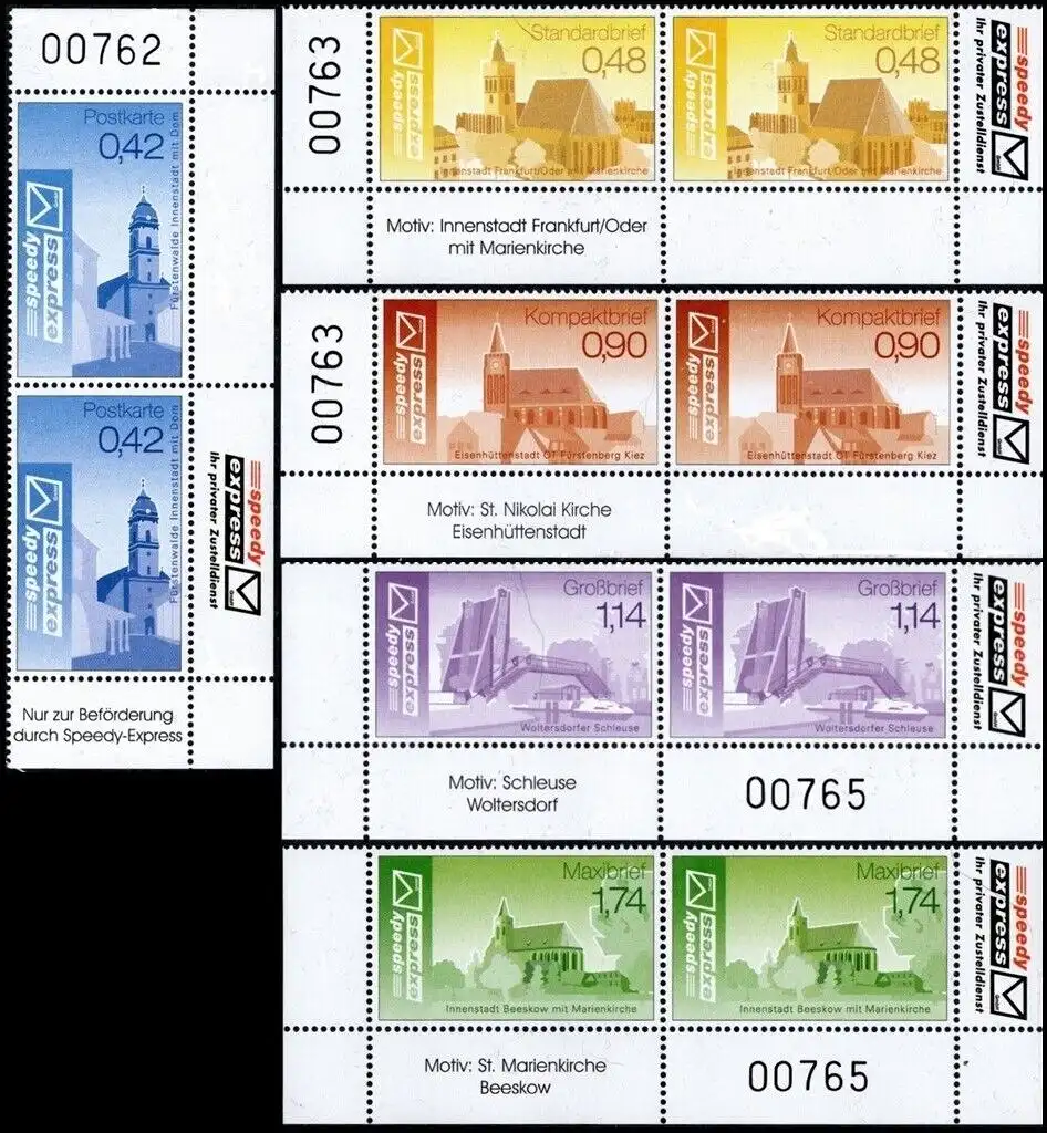 • MichSeite speedy-express: MiNr. 1 - 5, 22.09.2004, "Städte unserer Region", Satz, Bogennummer, postfrisch Beschreibung \nPostdienstleister: speedy-express, Woltersdorf bei Erkner \nAusgabeanlass: Briefmarkenausgabe "Städte unserer Region: Fürstenwalde, Frankfurt (Oder), Eisenhüttenstadt, Woltersdorf, Beeskow" Katalognummer: MiNr. 1 - 5 Ausgabedatum: 22.09.2004 Nominale: Satz (5 Werte) zu 0,42 EUR (2 x(, 0,48 EUR (2 x), 0,90 EUR (2 x), 1,14 EUR, 1,74 EUR (2 x) \nTyp: - \nErhaltung: nassklebend, gezähnt, postfrisch \nHinweis: Paare vom Eckrand mit Bogennummer