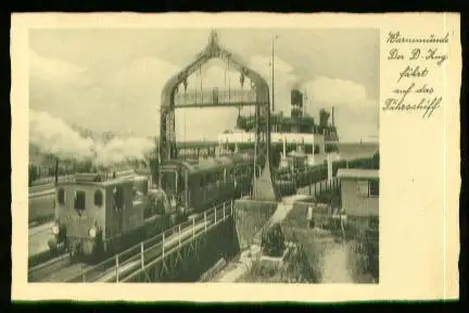 x00562; Travemünde d. D-Zug fährt auf das Fährschiff. - Ungebr. (Schifffahrt, Schiffe).