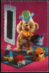 x05673; Stoffbär vor Spiegel. - Gelaufen 1969. Feuchtigkeitsspuren. Gelaufen, aber Briefmarke entfernt. (Spielzeug, Kuscheltiere).